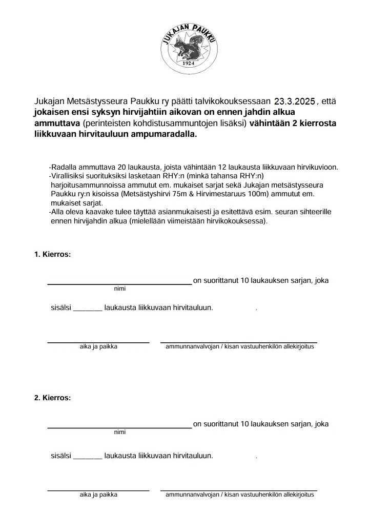 Jukajan Metsästysseura Paukku ry päätti (johtokunnan esityksestä) Talvikokouksessaan 23.3.2025, että jokaisen ensi syksyn hirvijahtiin aikovan on ennen jahdin alkua ammuttava (perinteisten kohdistusammuntojen lisäksi) vähintään 2 kierrosta ampumaradalla (20 laukausta, joista vähintään 12 laukausta liikkuvaan hirvikuvioon). Virallisiksi suorituksiksi lasketaan RHY:n (minkä tahansa RHY:n) harjoitusammunnoissa ammutut em. mukaiset sarjat sekä Jukajan metsästysseura Paukku ry:n kisoissa (Metsästyshirvi 75m & Hirvimestaruus 100m) ammutut em. mukaiset sarjat. Todistuksen em. ammuntojen suorittamisesta voit tulostaa tästä.